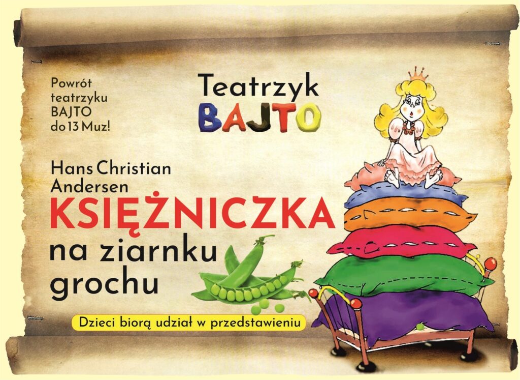 Teatrzyk Bajto znany jest z interaktywnych przedstawień, w których dzieci wraz z aktorami biorą udział w bajkowych perypetiach. Tym razem teatrzyk przedstawi, w sposób zgodny z klasycznym tekstem, acz nieco humorystycznie, baśń Hansa Christiana Andersena „Księżniczka na ziarnku grochu”.